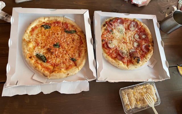 それだけでは足らないので、キャンプ場の焼き立てビザも。C&Cに来たらこのピザは欠かせません(´艸`*)